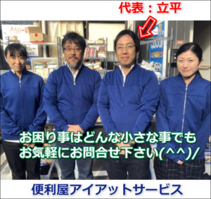 会社概要 屋号アイアットサービス 責任者立平 直 所在地大阪府寝屋川市宝町4-9 電話番号072-812-3820 FAX072-344-5284 URLhttps://benriya-aiatservice.com/ E-MAILinfo#aiatservice.com #を@に変えて下さい 問合せフォームhttps://benriya-aiatservice.com/form/ 事業内容便利屋業・不用品買取・ホームページ作成 便利屋アイアットサービス代表の立平(たつひら)と申します。 大学を卒業後、サラリーマン・自営業等、様々な経験を積み現在に至ります。 学生時代に部活で【助け合いの精神を忘れないように】と恩師からよくご指導いただきました。 アイアットサービスのアイは、【助け(合い)の精神】から取りました。 アットは、お客様から【アッという間に作業してくれたね】【もう終わったの?アッという 間だったね】と少しでも 喜んでいただけるようにと名付けました。できる限り迅速で丁寧な対応を心掛けております。 【趣味】サッカー 釣り 【好きな言葉】笑う門には福来る どんなに辛い事があっても、腹の底から笑えば元気になれる様な気がします。 小さい頃からお笑いが大好きで、吉本新喜劇はかかさず観ておりました。 ここ数年は、年末の「笑ってはいけない」は楽しみで仕方ありません。(笑) 【三方良し】サラリーマン時代に滋賀県に転勤になり、そこの取引先の方から教えていただいた言葉です。 近江商人の理念に「売り手良し、買い手良し、世間良し」 商売をやっていくにあたって、自分だけが 良ければいいというのではなく、買う人や周りの人が良いようにしなければいけないという考え方です。 スタッフ一同「三方良し」の精神で精一杯対応させていただきます。